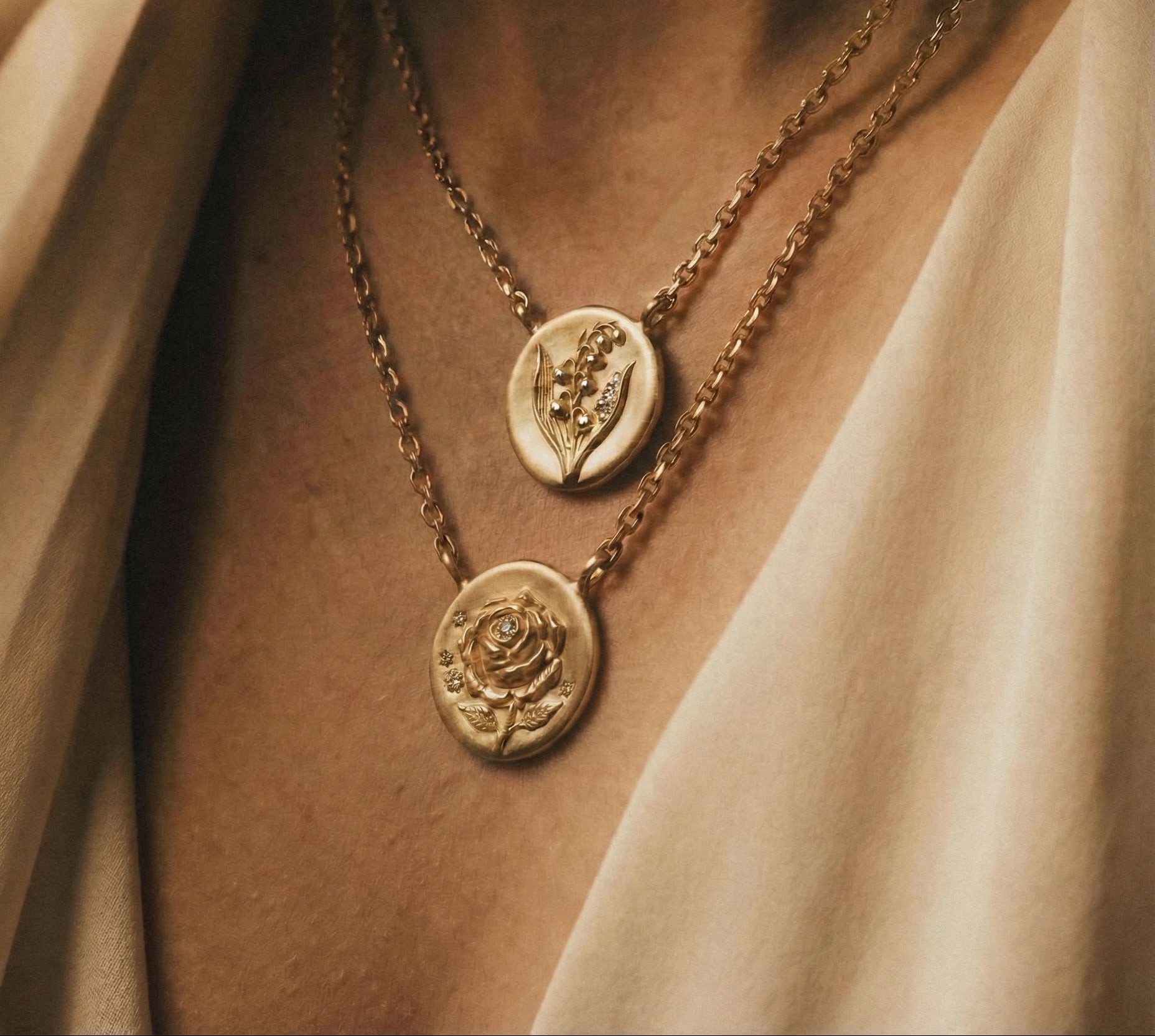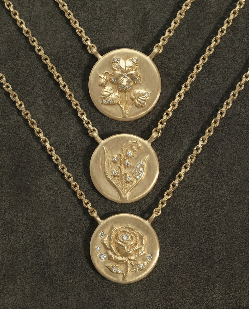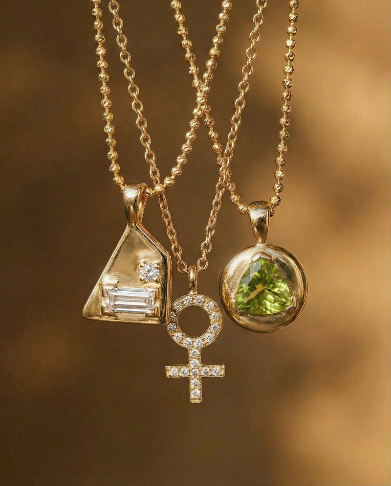 14k gold fine jewelry, handmade in California. Imbued with motifs of nature, universal geometry, and historical symbolism.